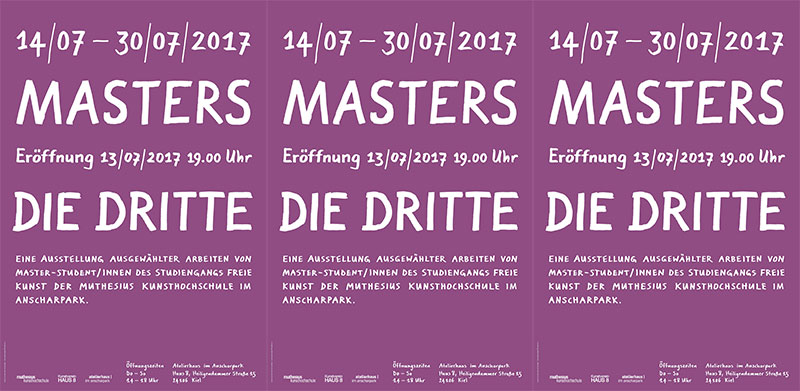 Werke ausgewählter Masterstudierender der Freien Kunst der Muthesius Kunsthochschule sind unter dem Titel “Masters – Die Dritte“ in den Räumen des Atelierhauses im Anscharpark in einer Gesamtausstellung zu sehen. Zu sehen sind die Masterarbeiten der angehenden Freien Künstlerinnen und Künstler aus den Lehrgebieten der Medienkunst, der Malerei, der Bildhauerei, der Freien Grafik und Keramik: Eugenia Bakurin, Nicci Braun, Olga Byvsheva, Yasmin Birkandan, Anna Bohn, Reza Ghadyani, Jakob Grebert, Svetlana Grigorieva, Lea Dall, Malin Hain, Peer Kringiel, Anke Müffelmann, Hannes Nienhüser, Dennis Paulsen, Meike Schlemmer, Regine Schulz, Daniela Takeva, Studio 18, Zitong Wu. Zur Begrüssung spricht Dr. Arne Zerbst, Präsident der Muthesius Kunsthochschule. Kurator Thomas Judisch wird eine Einführung geben. Die Muthesius Kunsthochschule führte als eine der ersten Kunsthochschulen Bachelor- und Masterstudiengänge der Freien Kunst ein. Nach 8 Semestern Studium wird der Bachelor of Fine Arts, nach weiteren 4 Semestern der Master of Fine Arts erworben. Die Jahresschau der Muthesius Kunsthochschule in der Legienstraße öffnet am 20.07.2017 ab 17 Uhr in den Gebäuden um den Campus Legienstraße in Kiel. Dort sind die Studienarbeiten des zurückliegenden Jahres aus Kunst, Raumstrategien, Kommunikationsdesign und Industriedesign zu sehen. Alle Interessierten sind eingeladen, auch zum umfangreichen Begleitprogramm. Mehr Infos unter www.muthesius-kunsthochschule.de