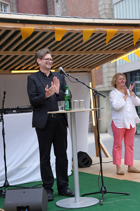Ein zwölfköpfiges studentisches Team hat zudem das Hoffest geplant – vom musikalischen Bühnenprogramm über Dekoration, Kioskverkauf und Foodtrucks bis hin zum kulturellen und unterhaltsamen Rahmenprogramm. Dr. Arne Zerbst, Präsident der Muthesius Kunsthochschule, begrüßte zur Eröffnungsfeier Stadtpräsidentin Bettina Aust, die in ihrem Grußwort auf die besondere Rolle der Kieler Kunsthochschule verwies. Sein besonderer Dank galt Vizepräsident Michael Breda, der seit 1999 die Muthesius Kunsthochschule geprägt hat – lange bevor sie staatliche Kunsthochschule wurde. Stellvertretend für alle helfenden Hände überreichte Zerbst Sonnenblumen an die Hausmeister Bernd Fischer und Bodo Ritscher.