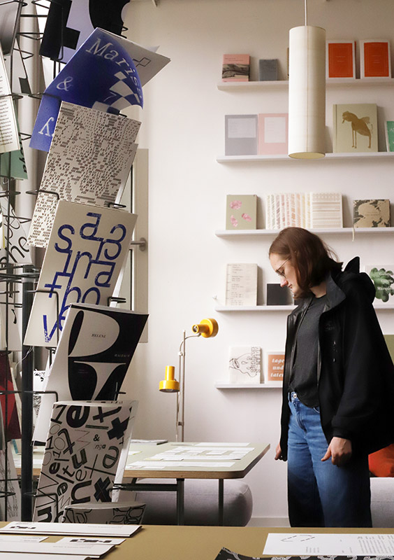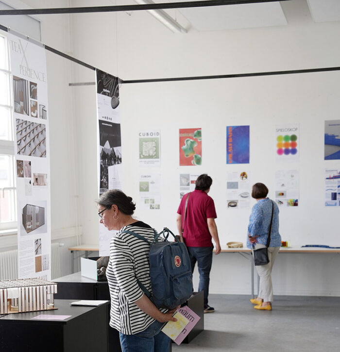 Das Besondere an der Jahresausstellung „Einblick/Ausblick“: Sie wird von Studierenden konzipiert und organisiert. So haben die Kommunikationsdesign-Studentinnen Karla Bartsch, Elisabeth Gerberding und Malin Peymann vom Logo bis zum Plakat das gesamte Erscheinungsbild der Jahresausstellung entworfen. Auch ein umfangreicher Jahreskatalog ist zum Fest erschienen. Digitale Einblicke in die Arbeiten der Studierenden sind auf der „Einblick/Ausblick“-Website zu sehen.