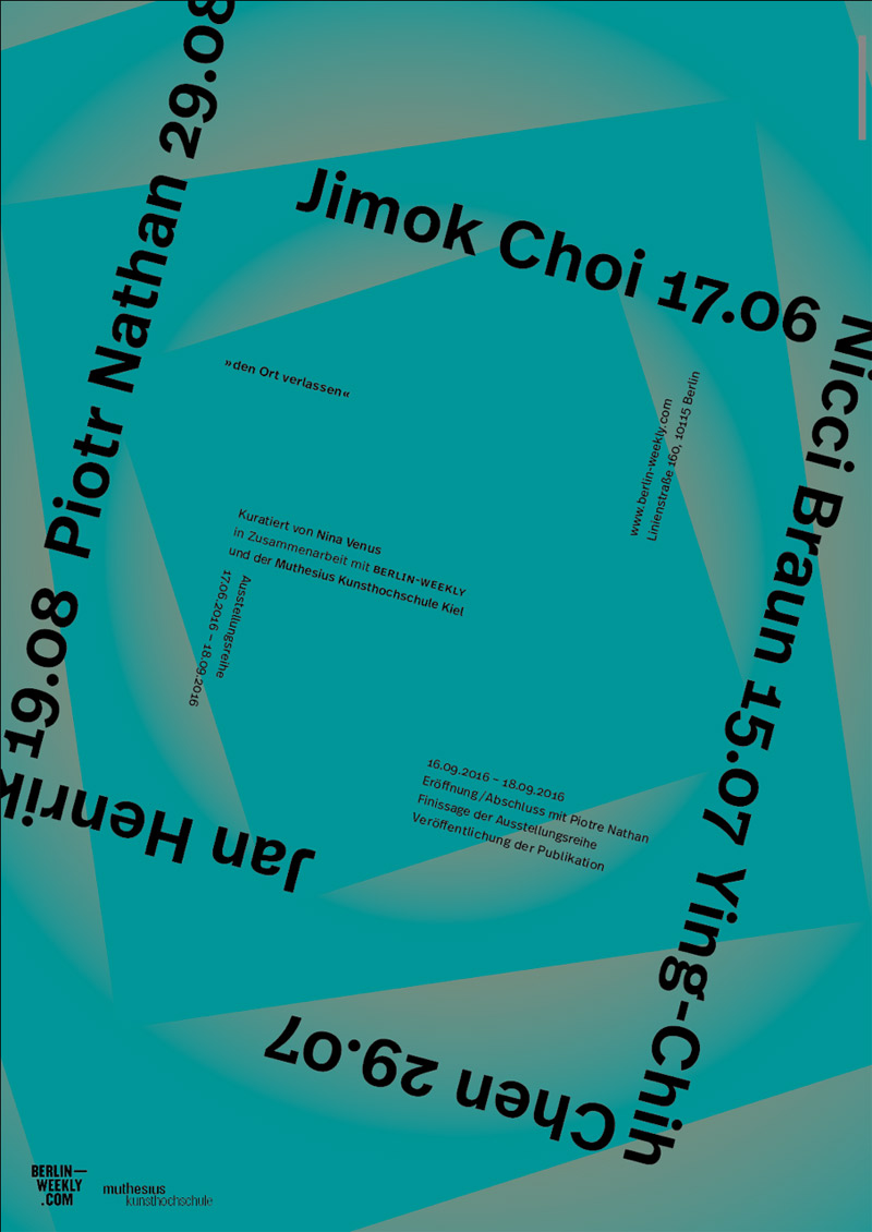 Die von Nina Venus kuratierte Ausstellungreihe „den Ort verlassen“ zeigt über einen Zeitraum von 3 Monaten nacheinander 5 Positionen zu transformativen Prozessen in der Berliner Galerie BERLIN-WEEKLY. Ein Absolvent, drei Studierende und Prof. Piotr Nathan werden „den Ort verlassen“ und entwickeln raumbezogene Arbeiten, die Veränderung, Verwandlung, Verortung künstlerisch sehr unterschiedlich thematisieren. BERLIN-WEEKLY ist ein auffälliger, hoher Ausstellungsraum und funktioniert wie eine Art öffentliche Bühne, auf der die Künstler eine für ihre Arbeit repräsentative und eigens erschaffene Installation für eine breite Öffentlichkeit inszenieren. BERLIN-WEEKLY funktioniert im öffentlichen Raum gleichermaßen wie als Internetplattform. (Näheres hierzu unter www.berlin-weekly.com)