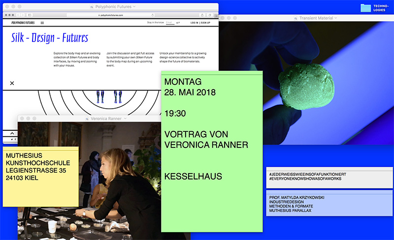 Polyphonic Futures — Collective Speculation, Design and Bio-Digital Interfaces – Veronica Ranner erforscht transdisziplinäre Schnittstellen zwischen Design, Wissenschaft und Kunst. In ihrer Praxis entwickelt sie  spekulative Szenarien und experimentelle Methoden für konstruktives, kollektives Entwerfen von Zukünften. Sie lehrt und stellt international aus — derzeit promoviert sie am Royal College of Art in London.